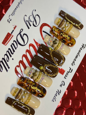 Elevate your nail game with these audacious long square bangle nails that command attention. Featuring a striking tortoise design paired with luxe gold accents and shimmering gold chrome details, these nails deliver maximum impact. The elongated square shape creates a bold, modern silhouette perfect for those who refuse to play it safe. Whether you're making a statement at an event or turning heads daily, these nails combine a sophisticated tortoiseshell pattern with eye-catching metallic finishes for an undeniably fierce look. Transform your fingertips into a fashion-forward accessory that screams confidence and style.